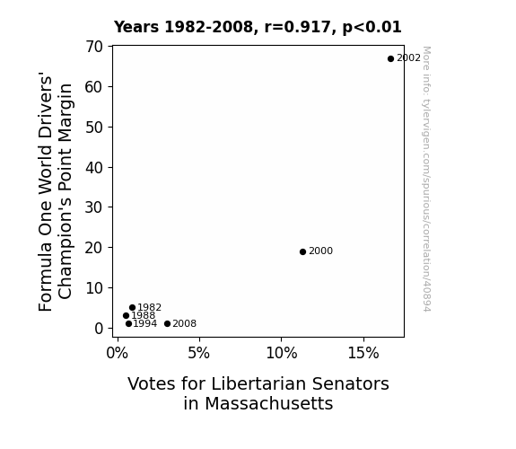 This means 84.2% of the change in the one variable (i.e., Votes for Libertarian Senators in Massachusetts) is predictable based on the change in the other (i.e., Formula One World Drivers' Champion's Point Margin) over the 6 years from 1982 through 2008.
