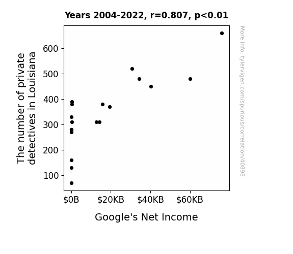This means 65.2% of the change in the one variable (i.e., Google's Net Income) is predictable based on the change in the other (i.e., The number of private detectives in Louisiana) over the 19 years from 2004 through 2022.