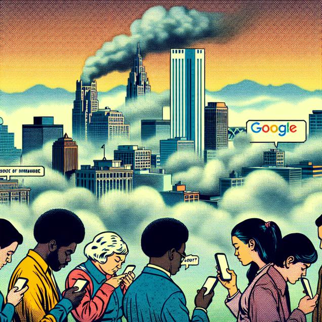 ChatGPT: Generate a comic-book-style illustration of the skyline of Milwaukee enveloped in a murky haze of air pollution, with muted colors that evoke a 1960s aesthetic. Show people indoors, engrossed in their phones, amidst the smog-filled atmosphere. Meanwhile, portray a surge of Google searches for "Titanic" symbolizing the enduring fascination with the epic voyage. Use a dotted halftone pattern to create hazy and atmospheric effects.