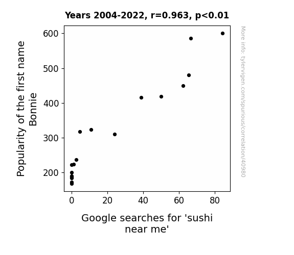 This means 92.7% of the change in the one variable (i.e., Google searches for 'sushi near me') is predictable based on the change in the other (i.e., Popularity of the first name Bonnie) over the 19 years from 2004 through 2022.