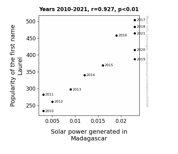 This means 85.9% of the change in the one variable (i.e., Solar power generated in Madagascar) is predictable based on the change in the other (i.e., Popularity of the first name Laurel) over the 12 years from 2010 through 2021.