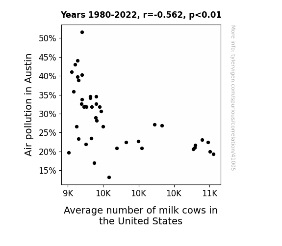 This means 31.6% of the change in the one variable (i.e., Average number of milk cows in the United States) is predictable based on the change in the other (i.e., Air pollution in Austin) over the 43 years from 1980 through 2022.