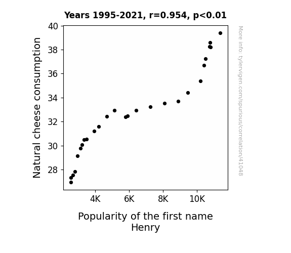 This means 91.1% of the change in the one variable (i.e., Popularity of the first name Henry) is predictable based on the change in the other (i.e., Natural cheese consumption) over the 27 years from 1995 through 2021.