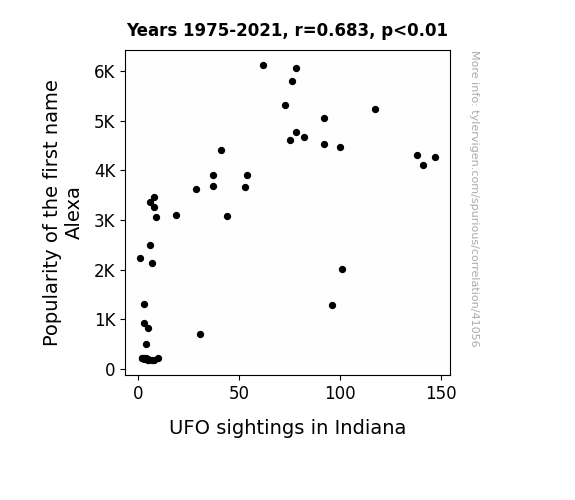 This means 46.6% of the change in the one variable (i.e., UFO sightings in Indiana) is predictable based on the change in the other (i.e., Popularity of the first name Alexa) over the 47 years from 1975 through 2021.