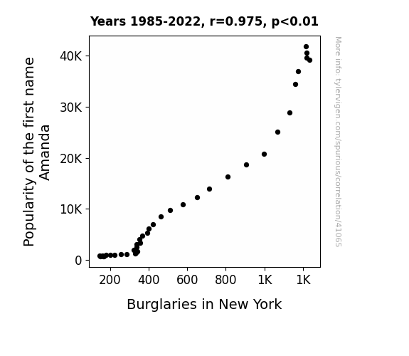 This means 95.1% of the change in the one variable (i.e., Burglaries in New York) is predictable based on the change in the other (i.e., Popularity of the first name Amanda) over the 38 years from 1985 through 2022.
