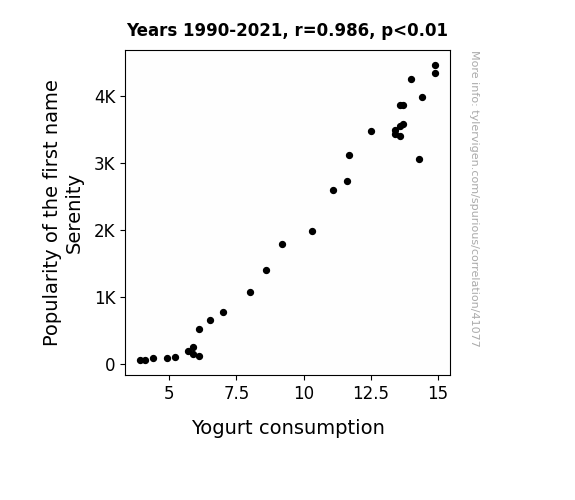 This means 97.2% of the change in the one variable (i.e., Yogurt consumption) is predictable based on the change in the other (i.e., Popularity of the first name Serenity) over the 32 years from 1990 through 2021.