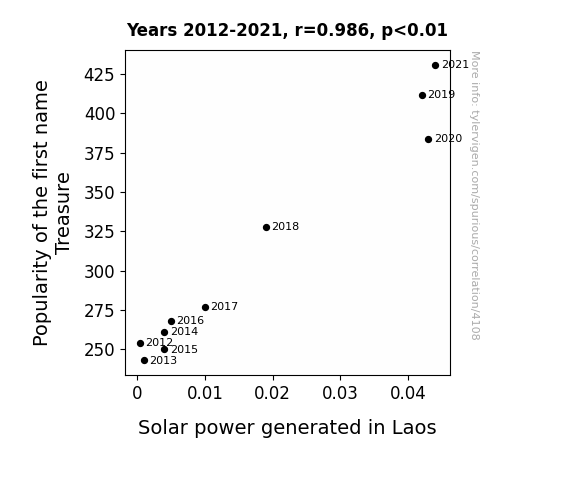 User prompt: Please make up a funny explanation for how an increase in Popularity of the first name Treasure caused Solar power generated in Laos to increase.