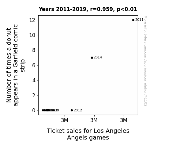 This means 91.9% of the change in the one variable (i.e., Ticket sales for Los Angeles Angels games) is predictable based on the change in the other (i.e., Number of times a donut appears in a Garfield comic strip) over the 9 years from 2011 through 2019.