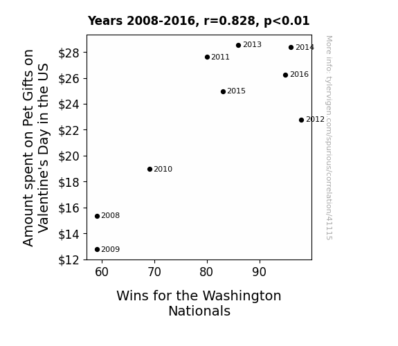 This means 68.5% of the change in the one variable (i.e., Wins for the Washington Nationals) is predictable based on the change in the other (i.e., Amount spent on Pet Gifts on Valentine's Day in the US) over the 9 years from 2008 through 2016.