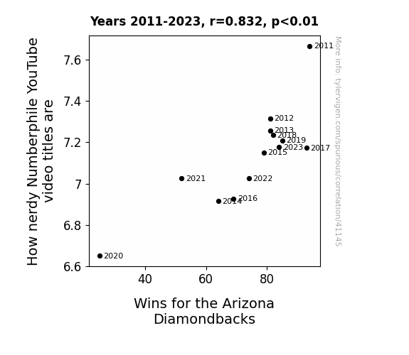 This means 69.2% of the change in the one variable (i.e., Wins for the Arizona Diamondbacks) is predictable based on the change in the other (i.e., How nerdy Numberphile YouTube video titles are) over the 13 years from 2011 through 2023.