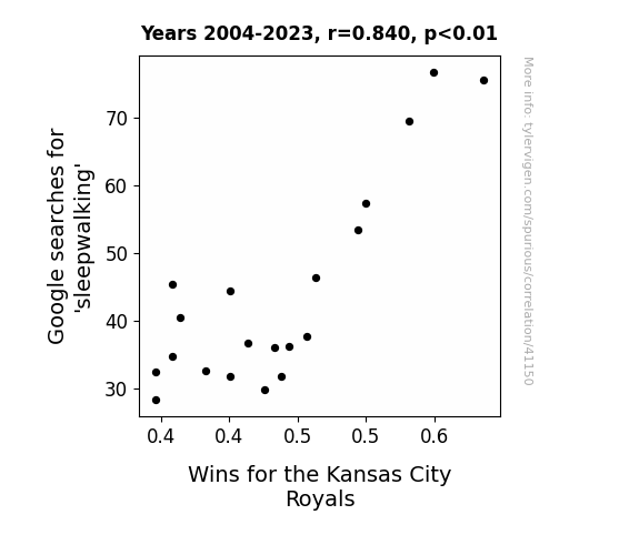 This means 70.5% of the change in the one variable (i.e., Wins for the Kansas City Royals) is predictable based on the change in the other (i.e., Google searches for 'sleepwalking') over the 20 years from 2004 through 2023.