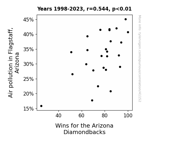 This means 29.6% of the change in the one variable (i.e., Wins for the Arizona Diamondbacks) is predictable based on the change in the other (i.e., Air pollution in Flagstaff, Arizona) over the 26 years from 1998 through 2023.