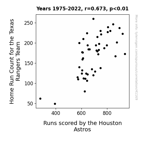 This means 45.2% of the change in the one variable (i.e., Runs scored by the Houston Astros) is predictable based on the change in the other (i.e., Home Run Count for the Texas Rangers Team) over the 48 years from 1975 through 2022.