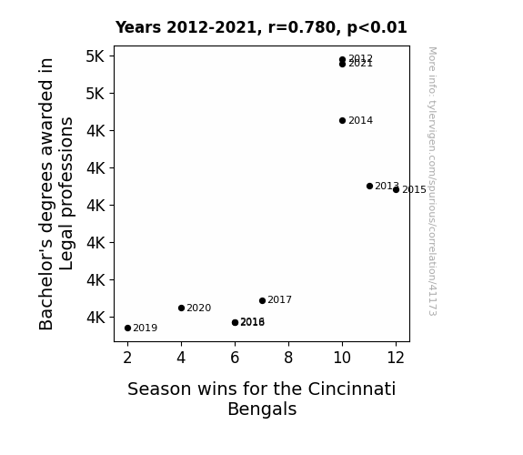 This means 60.8% of the change in the one variable (i.e., Season wins for the Cincinnati Bengals) is predictable based on the change in the other (i.e., Bachelor's degrees awarded in Legal professions) over the 10 years from 2012 through 2021.