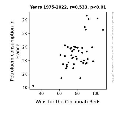 This means 28.4% of the change in the one variable (i.e., Wins for the Cincinnati Reds) is predictable based on the change in the other (i.e., Petroluem consumption in France) over the 48 years from 1975 through 2022.
