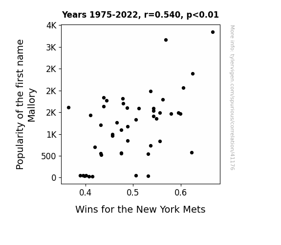 This means 29.2% of the change in the one variable (i.e., Wins for the New York Mets) is predictable based on the change in the other (i.e., Popularity of the first name Mallory) over the 48 years from 1975 through 2022.