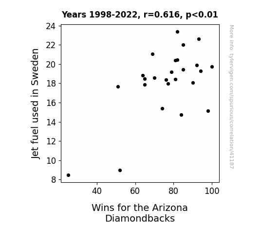 This means 37.9% of the change in the one variable (i.e., Wins for the Arizona Diamondbacks) is predictable based on the change in the other (i.e., Jet fuel used in Sweden) over the 25 years from 1998 through 2022.