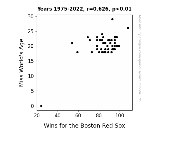 This means 39.2% of the change in the one variable (i.e., Wins for the Boston Red Sox) is predictable based on the change in the other (i.e., Miss World's Age) over the 48 years from 1975 through 2022.