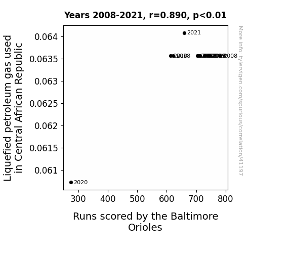 This means 79.2% of the change in the one variable (i.e., Runs scored by the Baltimore Orioles) is predictable based on the change in the other (i.e., Liquefied petroleum gas used in Central African Republic) over the 14 years from 2008 through 2021.