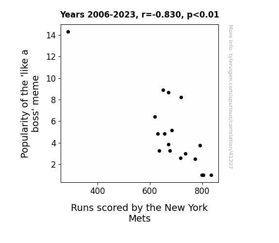 This means 68.9% of the change in the one variable (i.e., Runs scored by the New York Mets) is predictable based on the change in the other (i.e., Popularity of the 'like a boss' meme) over the 18 years from 2006 through 2023.