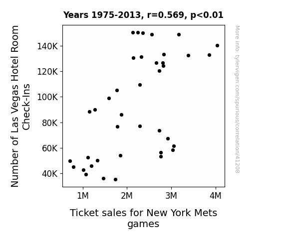 This means 32.4% of the change in the one variable (i.e., Ticket sales for New York Mets games) is predictable based on the change in the other (i.e., Number of Las Vegas Hotel Room Check-Ins) over the 39 years from 1975 through 2013.