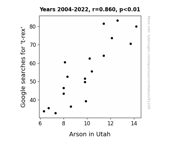 This means 73.9% of the change in the one variable (i.e., Arson in Utah) is predictable based on the change in the other (i.e., Google searches for 't-rex') over the 19 years from 2004 through 2022.