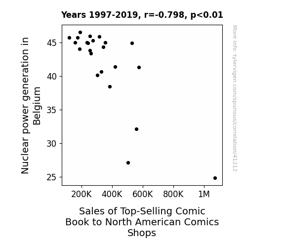 This means 63.7% of the change in the one variable (i.e., Sales of Top-Selling Comic Book to North American Comics Shops) is predictable based on the change in the other (i.e., Nuclear power generation in Belgium) over the 23 years from 1997 through 2019.