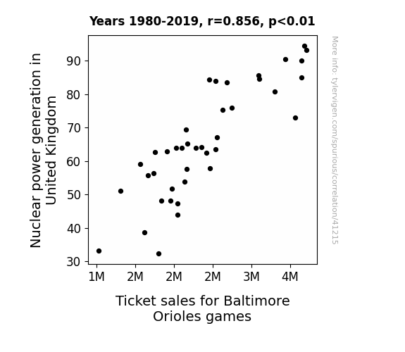 This means 73.2% of the change in the one variable (i.e., Ticket sales for Baltimore Orioles games) is predictable based on the change in the other (i.e., Nuclear power generation in United Kingdom) over the 40 years from 1980 through 2019.