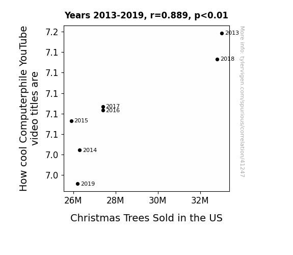 This means 79.1% of the change in the one variable (i.e., Christmas Trees Sold in the US) is predictable based on the change in the other (i.e., How cool Computerphile YouTube video titles are) over the 7 years from 2013 through 2019.