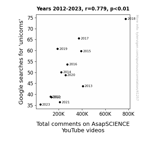 This means 60.7% of the change in the one variable (i.e., Total comments on AsapSCIENCE YouTube videos) is predictable based on the change in the other (i.e., Google searches for 'unicorns') over the 12 years from 2012 through 2023.