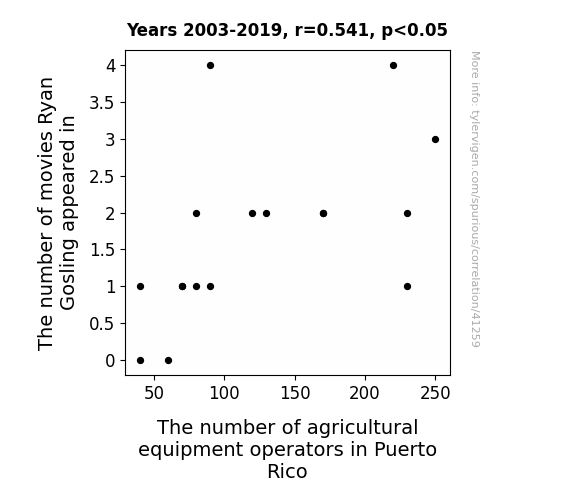 This means 29.3% of the change in the one variable (i.e., The number of agricultural equipment operators in Puerto Rico) is predictable based on the change in the other (i.e., The number of movies Ryan Gosling appeared in) over the 17 years from 2003 through 2019.