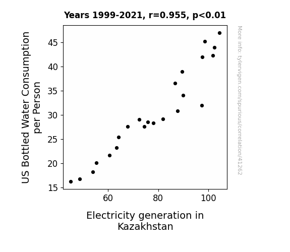 This means 91.1% of the change in the one variable (i.e., Electricity generation in Kazakhstan) is predictable based on the change in the other (i.e., US Bottled Water Consumption per Person) over the 23 years from 1999 through 2021.