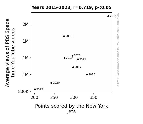 This means 51.6% of the change in the one variable (i.e., Points scored by the New York Jets) is predictable based on the change in the other (i.e., Average views of PBS Space Time YouTube videos) over the 9 years from 2015 through 2023.