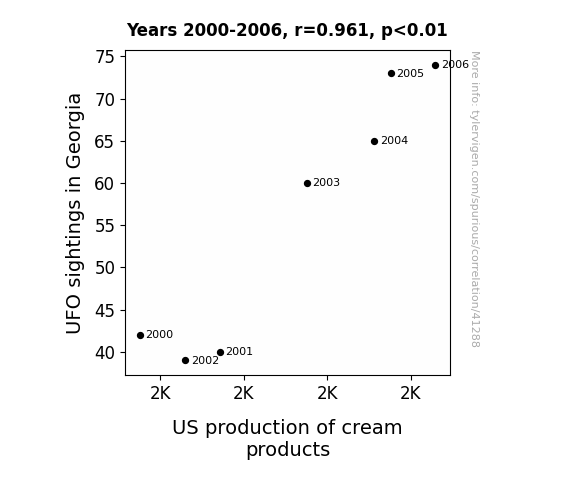 This means 92.3% of the change in the one variable (i.e., US production of cream products) is predictable based on the change in the other (i.e., UFO sightings in Georgia) over the 7 years from 2000 through 2006.