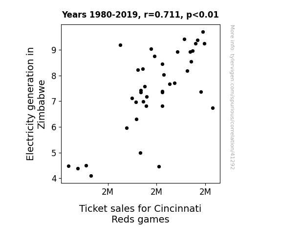 This means 50.6% of the change in the one variable (i.e., Ticket sales for Cincinnati Reds games) is predictable based on the change in the other (i.e., Electricity generation in Zimbabwe) over the 40 years from 1980 through 2019.