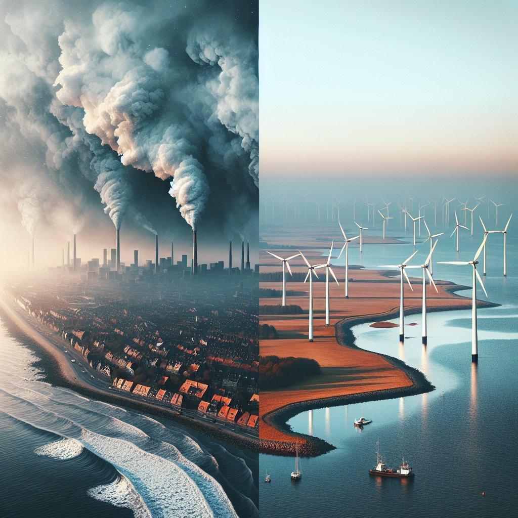 Prompt: Prompt: Create an image that portrays the contrasting impact of reduced air pollution on wind patterns through two scenes: a shrouded and smog-filled skyline of Buffalo, where the cityscape is barely visible due to heavy pollution, and a tranquil Danish coastal landscape with wind turbines spinning at a slower pace than usual due to the lack of wind power. The hazy, polluted skyline and the calm, still waves by the coast should visually capture the impact of reduced air pollution on energy generation. The depiction should include only scenes, people, and objects, it should not include text or speech bubbles.