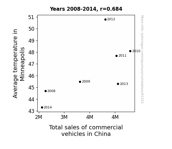 This means 46.8% of the change in the one variable (i.e., Total sales of commercial vehicles in China) is predictable based on the change in the other (i.e., Average temperature in Minneapolis) over the 7 years from 2008 through 2014.