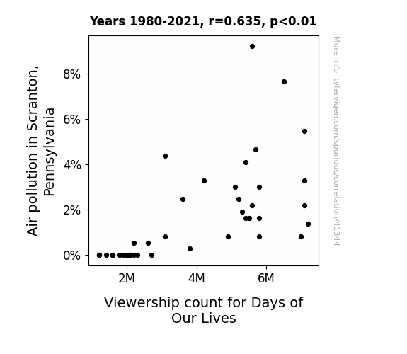 This means 40.3% of the change in the one variable (i.e., Viewership count for Days of Our Lives) is predictable based on the change in the other (i.e., Air pollution in Scranton, Pennsylvania) over the 42 years from 1980 through 2021.