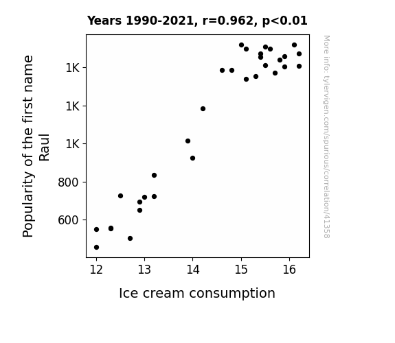 This means 92.4% of the change in the one variable (i.e., Ice cream consumption) is predictable based on the change in the other (i.e., Popularity of the first name Raul) over the 32 years from 1990 through 2021.