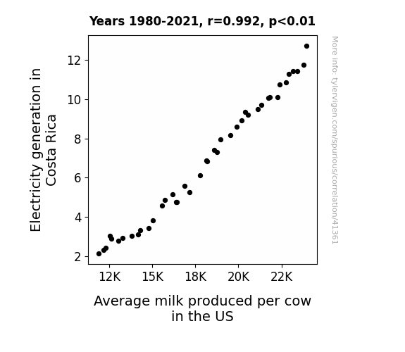 This means 98.5% of the change in the one variable (i.e., Average milk produced per cow in the US) is predictable based on the change in the other (i.e., Electricity generation in Costa Rica) over the 42 years from 1980 through 2021.