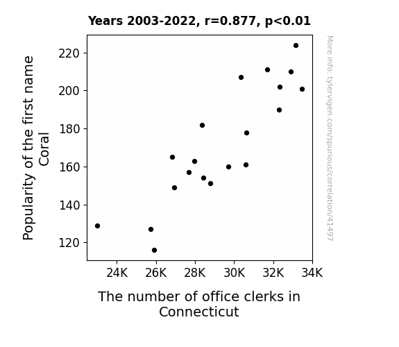 This means 76.9% of the change in the one variable (i.e., The number of office clerks in Connecticut) is predictable based on the change in the other (i.e., Popularity of the first name Coral) over the 20 years from 2003 through 2022.