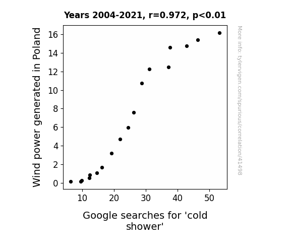 This means 94.5% of the change in the one variable (i.e., Google searches for 'cold shower') is predictable based on the change in the other (i.e., Wind power generated in Poland) over the 18 years from 2004 through 2021.