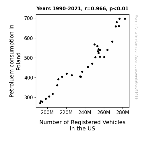 This means 93.3% of the change in the one variable (i.e., Number of Registered Vehicles in the US) is predictable based on the change in the other (i.e., Petroluem consumption in Poland) over the 32 years from 1990 through 2021.