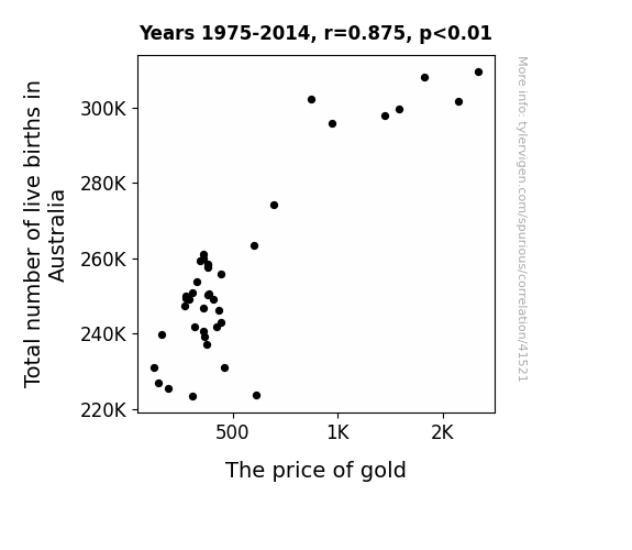 This means 76.5% of the change in the one variable (i.e., The price of gold) is predictable based on the change in the other (i.e., Total number of live births in Australia) over the 40 years from 1975 through 2014.