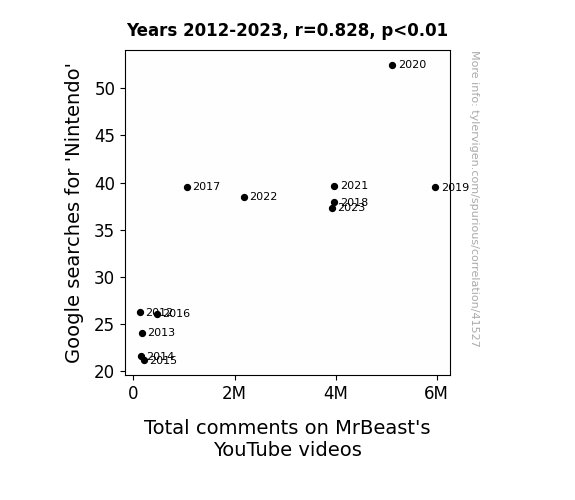 This means 68.6% of the change in the one variable (i.e., Total comments on MrBeast's YouTube videos) is predictable based on the change in the other (i.e., Google searches for 'Nintendo') over the 12 years from 2012 through 2023.