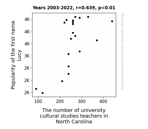 This means 40.8% of the change in the one variable (i.e., The number of university cultural studies teachers in North Carolina) is predictable based on the change in the other (i.e., Popularity of the first name Lucy) over the 20 years from 2003 through 2022.