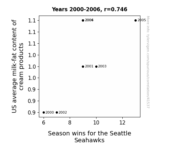 This means 55.6% of the change in the one variable (i.e., Season wins for the Seattle Seahawks) is predictable based on the change in the other (i.e., US average milk-fat content of cream products) over the 7 years from 2000 through 2006.