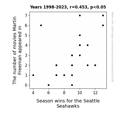 This means 20.5% of the change in the one variable (i.e., Season wins for the Seattle Seahawks) is predictable based on the change in the other (i.e., The number of movies Martin Freeman appeared in) over the 26 years from 1998 through 2023.