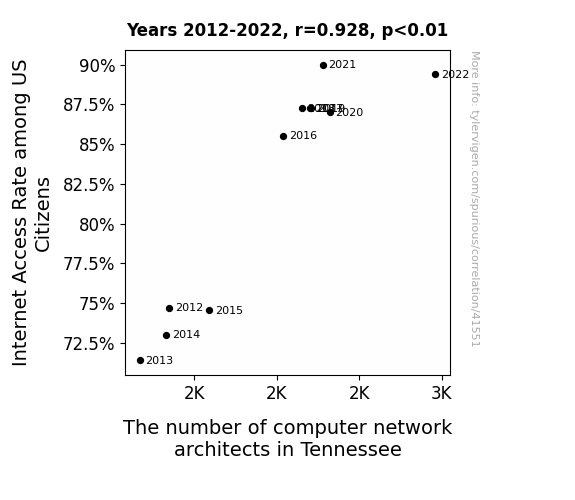 This means 86.2% of the change in the one variable (i.e., The number of computer network architects in Tennessee) is predictable based on the change in the other (i.e., Internet Access Rate among US Citizens) over the 11 years from 2012 through 2022.