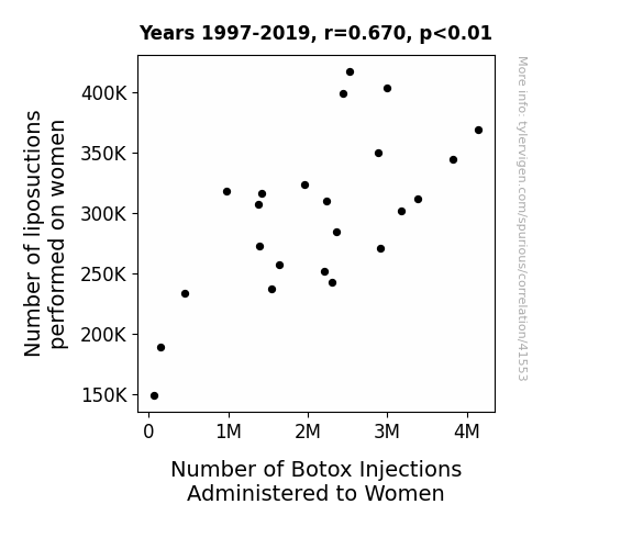 This means 44.9% of the change in the one variable (i.e., Number of Botox Injections Administered to Women) is predictable based on the change in the other (i.e., Number of liposuctions performed on women) over the 23 years from 1997 through 2019.